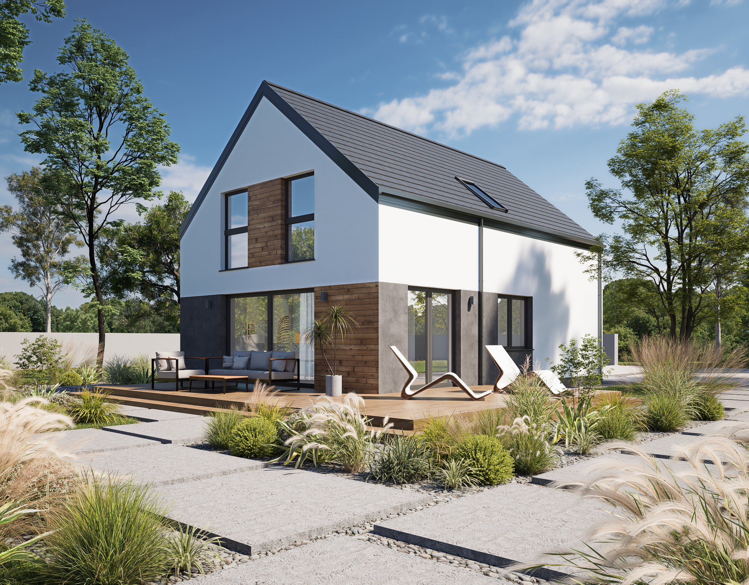 Dach wykonywany jest jako kompletne pokrycie dachowe z blachodachówki lub dachówki betonowej płaskiej z podstawowej palety kolorów producenta. Zastosowane materiały zapewniają trwałość, estetyczny wygląd oraz skuteczną ochronę budynku przed warunkami atmosferycznymi.
